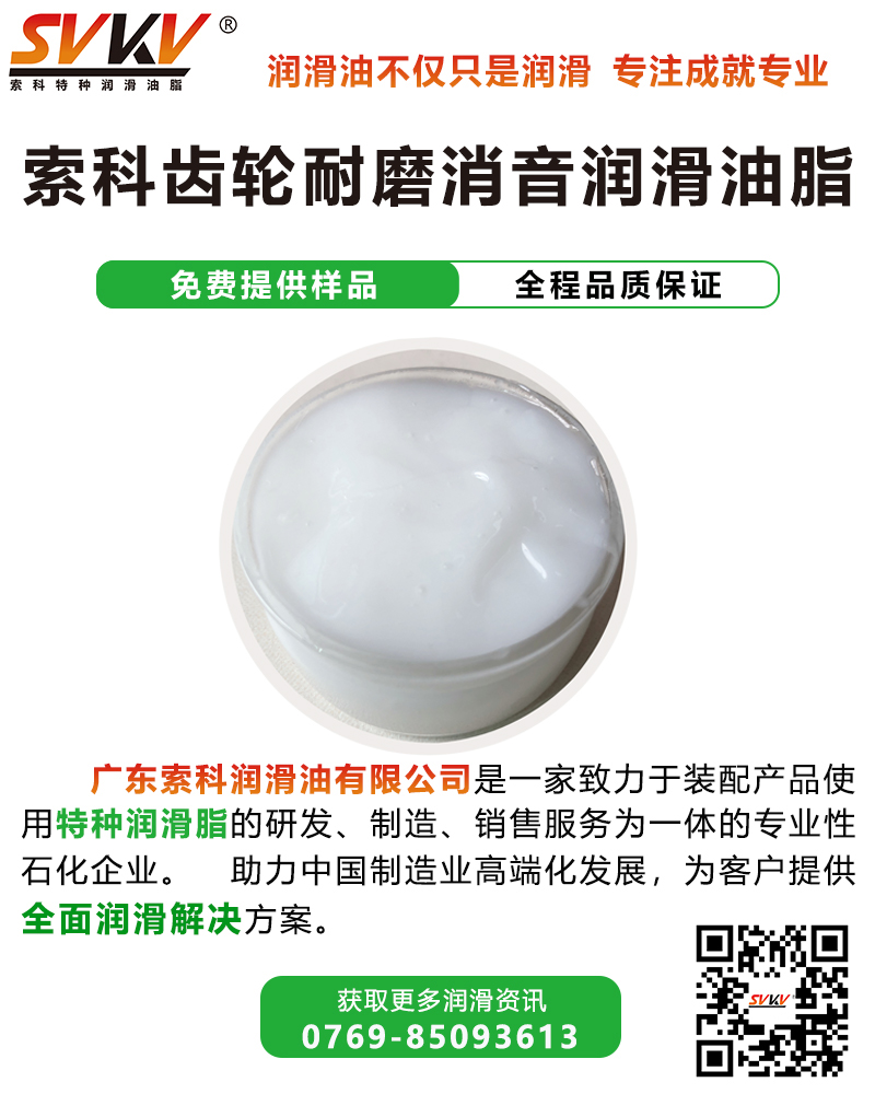 廣東索科潤滑油有限公司是一家致力于裝配產(chǎn)品使用特種潤滑脂的研發(fā)、生產(chǎn)、定制、服務(wù)為一體的專業(yè)性石化企業(yè)。致力為制造業(yè)客戶,提供專業(yè)的選油方案,協(xié)助客戶解決產(chǎn)品裝配時(shí)的潤滑難題,還可根據(jù)客戶特殊需求訂做適合的潤滑油品。有效提高產(chǎn)品性能、減低維護(hù)成本,索科助力制造業(yè)高端化發(fā)展!