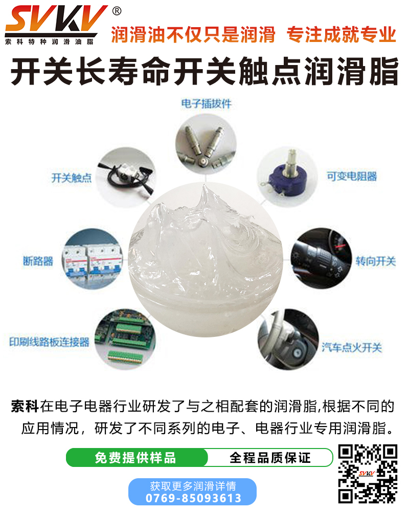 索科SVKV長壽命開關(guān)觸點(diǎn)潤滑脂廣泛用于汽車、家電、玩具等開關(guān),主要有微動(dòng)開關(guān)、柱式開關(guān)、滑動(dòng)開關(guān)、旋轉(zhuǎn)開關(guān)、彈片、觸點(diǎn)、簧壓搖桿開關(guān)或壓按式開關(guān),有效減少電弧和降低磨損的特性使其操作順暢、觸感優(yōu)異且提高開關(guān)導(dǎo)電性能,使用產(chǎn)品壽命更長。